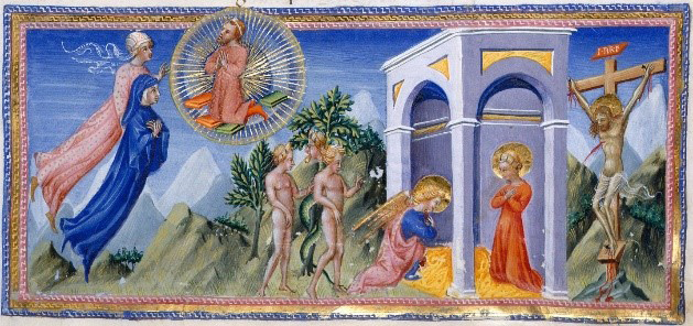 Giovanni di Paolo: Dante und Beatrice als Zeugen des Mysteriums der Erlösung. Buchmalerei, 1444-1450, Yates Thompson Manuscript 36, British Library, London