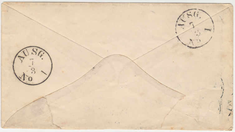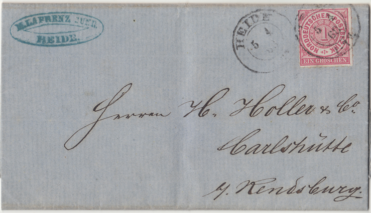 Brief von Heide an Herrn H. Holler & Co/ Carlshütte/ Rendsburg. MiNr 4, 1 Gr durchstochen; Zweikreisstempel HEIDE/ 5 4/ 68. Auf der Rückseite: Ausgabestempel Rendsburg 5/4.