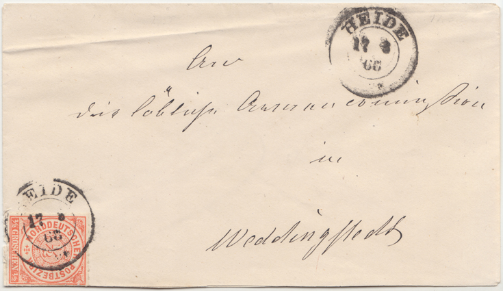 Brief von Heide nach Weddingstedt (im Kreis Dithmarschen) An die löbliche Armenienmission/ in/ Weddingstedt. Frankiert mit MiNr 3, ½ Gr, orange durchstochen, entwertet mit Zweikreisstempel HEIDE/ 17 8/68.