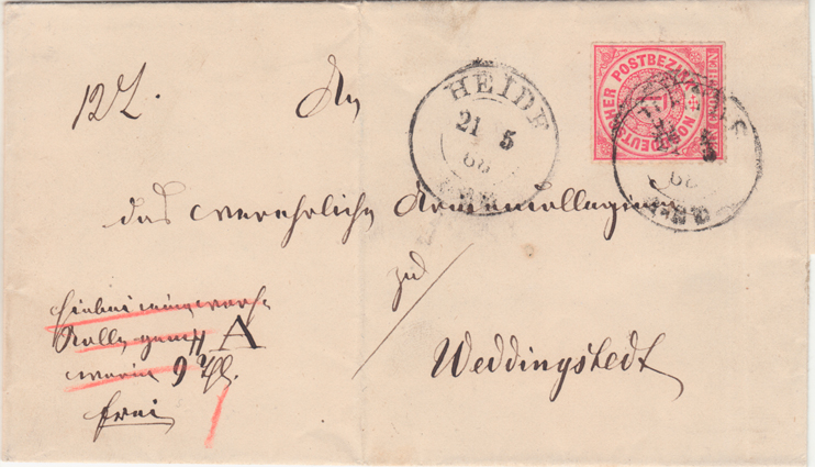 An/ das verehrliche Armencollegium/ zu/ Weddingstedt. Hiebei eine vorbe<zeichnete>/ Rolle zum II A / worin / 9 Thl./ frei. Frankiert mit MiNr 4, 1 Gr durchstochen; zweimal Zweikreisstempel HEIDE/ 21 5/ 68. Mit Rötelstift unterstrichen und 1 Groschen angeschrieben.