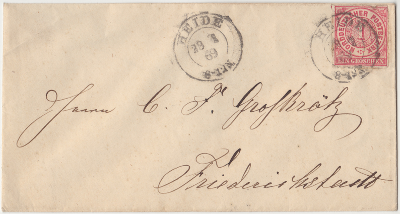 Brief von Heide an Herrn C. F. Groskrötz/ Friedrichstadt. MiNr 4, 1 Gr durchstochen; Zweikreis-stempel HEIDE 28 1/ 69. Auf der Rückseite: Ausgabestempel Friedrichstadt 29/1.
