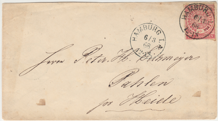 Michel-Nr. 4 auf Brief von Hamburg nach Heide. Herrn Peter. Tb. Eichmeyer/ Pahlen/ pr Heide. Zweimal Kreisstempel HAMBURG I. A. 12-1 N./ 6/3/68;