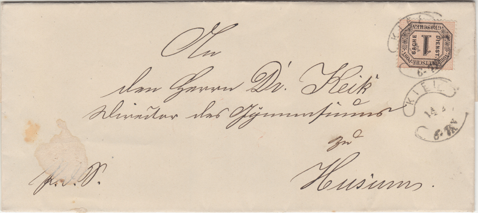 MiNr. 4 auf einer portopflichtigen Dienstsache des Provinzial-Schulkollegiums für Schleswig-Holsteins in Kiel An/ den Herrn Dr. Keck/ Director des Gymnasiums/ zu/ Husum. Zweimal Wurststempel KIEL/ 14 4/ 71/ 6-7V, rückseitig: Dienstsiegel und Ausgabestempel № 2/ 15/2.