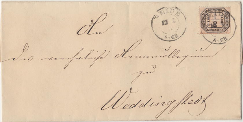 MiNr. 3, ½ Groschen auf Dienstbrief An/ das verehrliche Armencollegium/ zu/ Weddingstedt vom 13. Februar 1870. HEIDE/ 13 2/ 70/ 5-6N.