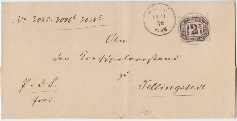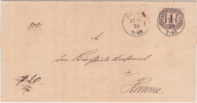 MiNr. 5, 2 Groschen auf Dienstbrief An/ den Kirchspielvorstand/ zu/ Tellingstedt vom 18. November 1870. HEIDE/ 18 11/ 70/ 7-8N.