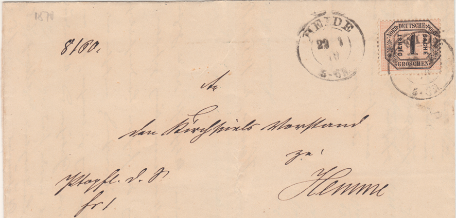 Der Kirchspiels Vorstand zu Heide an den Kirchspiels Vorstand in Hemme; Michel-Nr. 4 auf portopflichtigen Dienstsachen.