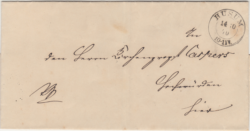 An/ den Herrn Kirchenpropst Caspers/ Hochwürden/ hier; Zweikreisstempel HUSUM/ 14 10/ 70/ 10-11V