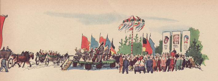 In der wuselnden Menge erkannte ich einige Kinder, blieb aber am Rand des Geschehens stehen, wartete, bis ein alter Mann meinen Namen aufrief und gesellte mich zur Klasse 1b. Wir mussten uns in Zweierreihen aufstellen, wurden dann ins Gebäude geführt und gingen in unseren neuen Klassenraum. Vorne stand ein Pult und hinten an der Wand hingen Bilder von Stalin, Pieck und Grotewohl, die streng auf uns herabblickten.
