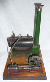 Die Dampfmaschine bestand aus einem Kessel, der auf ein Blechgestell aufgelötet war, und aus einem Schornstein, der aber nur zur Zierde diente; beide Teile waren grün bemalt; der Kessel und die Leitungen bestanden aus Kupfer. An der Seite war ein Glasrohr befestigt, das den Wasserstand im Kessel anzeigte. Von oben ging ein Rohr zum Zylinder ab, und es waren eine Pfeife mit hölzernem Griff und ein Sicherheitsventil aufgeschraubt. Der Zylinder mit seiner Ventilstange trieb das Schwungrad an, auf dessen Achse eine kleine Felge geschraubt war, die mittels Riemen das Zubehör antreiben sollte. Das Schutzblech über dem Wasserstandsanzeiger war abgebrochen und musste von meinem Opa wieder angelötet werden.