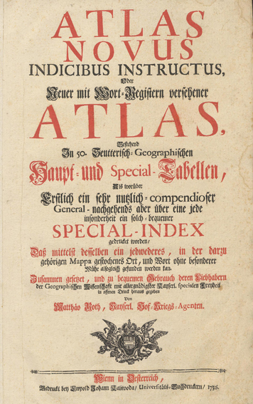 rechts: Seutter, Matthäus; Roth, Matthäus [Hrsg.]: Atlas Novus Indicibus Instructus, Oder Neuer mit Wort-Registern versehener Atlas: bestehend in 50. Seutterisch-Geographischen Haupt- und Special-Tabellen, als worueber erstlich ein sehr nutzlich-compendioser General- nachgehends aber ueber eine jede insonderheit ein solch-bequemer Special-Index gedrucket worden, daß mittelst desselben ein jedwederes, in der darzu gehörigen Mappa gestochenes Ort, und Wort ohne besonderer Mühe alsogleich gefunden werden kann. […] Wien […], 1736.