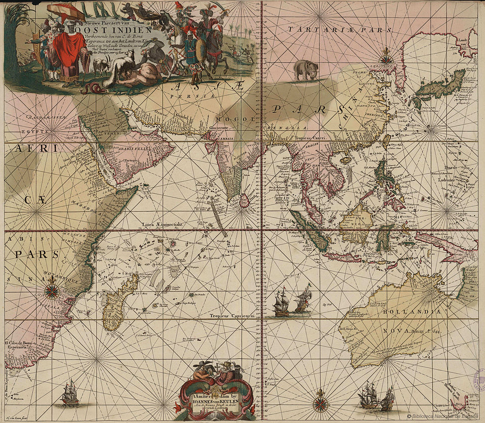 Nieuwe Pascaert van Oost Indien 1680-1735. In: De Nieuwe Groote Lichtende Zee-Fakkel, ʼt Derde Deel. Verthoonende de Kusten van Granaden, Catalonien, Provence, Italien, Dalmatien, Grieken, Thracien, Natolien, Lyrien, Egypten, en de geheele Noordkust van Barbaryen, met alle haer onderbehoorende en tusschen leggende Eylanden. […] Door Claas Jansz. Vooght. Amsterdam 1682. |