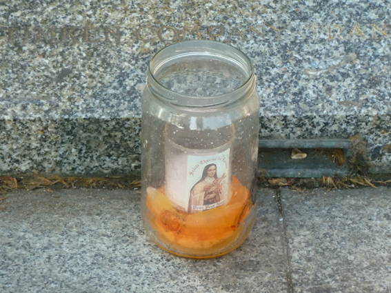 Dass aber auch diese Reinigungsaktion keine Dauer verspricht, konnte man schon wieder Mitte Oktober sehen. Jemand hatte ein kleines Glas mit Kerze und einem Bild der Thérèse von Lisieux (1873-1897) vor den schwarzen Marmorsockel gestellt. Im Gegensatz zum großbürgerlichen Selbstverständnis der Belle Époque widmete Thérèse ihr Leben den Mitmenschen. Ihre Hingabe äußerte sich in den kleinen Gesten des Alltags und sie begründete die théologie de la „petite voie“, ihren so genannten „kleinen Weg“ der Liebe. In der Katholischen Kirche hat sie den Gedanken der Gotteskindschaft auf eine Art und Weise aktualisiert, die viele Millionen Menschen bis heute nachhaltig fasziniert, daher wurde sie 1925 von Pius XI. heilig gesprochen und 1997 von Papst Johannes Paul II. zur Kirchenlehrerin erhoben.