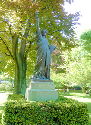 Nur wenige Meter weiter am westlichen Ende der Allée des Cygnes nahe dem Eiffelturm steht auf einem schmalen künstlichen Damm in der Seine eine elfeinhalb Meter hohe Kopie der Freiheitsstatue. Entworfen hat sie der Bildhauer Frédéric Auguste Bartholdi (1834-1904) als Geschenk der Stadt Paris zur Unabhängigkeit der Vereinigten Staaten von Amerika im Jahre 1876. Das Bronzemodell der „Liberté éclairant le monde“ wurde auf der Weltausstellung des Jahres 1900 gezeigt. Seit 1906 steht es im Jardin du Luxembourg. Anlässlich des 100. Geburtstages der Freiheitsstatue schenkte die International Herald Tribune der französischen Nation einen Abguss der Flamme, die nun ihrerseits in Europa als ein Symbol für Demokratie und Meinungsfreiheit gilt.