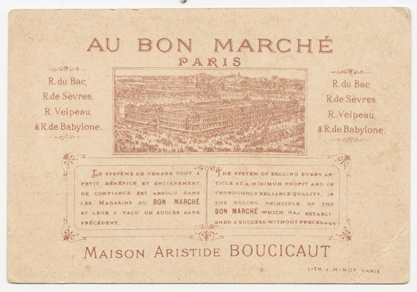 Reklame spielte eine große Rolle in der Arbeit von Boucicaut. Um Kunden anzulocken, ließ er Kärtchen aus stabileren Karton mit Kalendern, Informationen zum Kaufhaus, zu Saisonartikeln und zu Werbeveranstaltungen verteilen, auf deren Vorderseite sich jeweils ein buntes Bild befand.