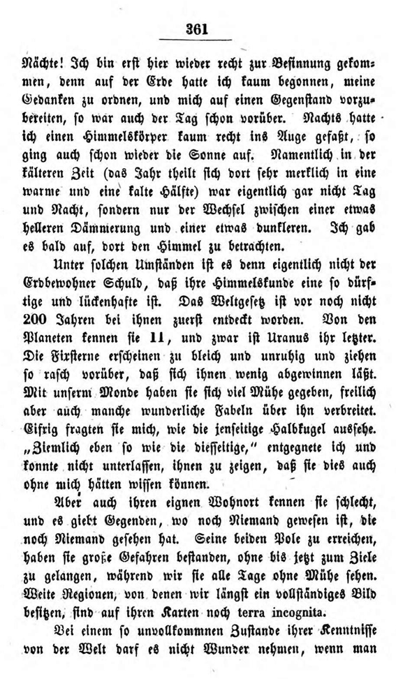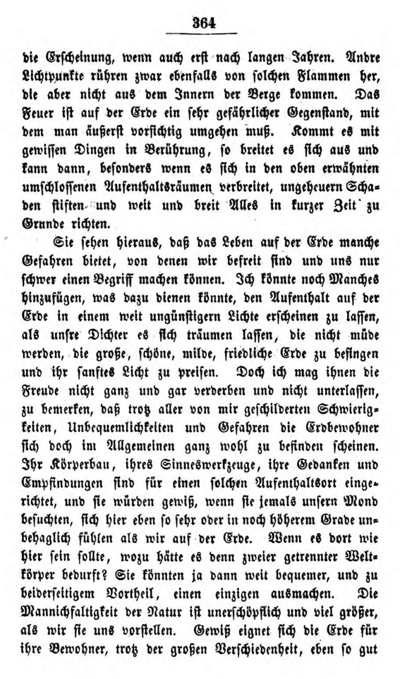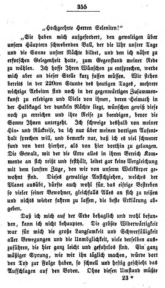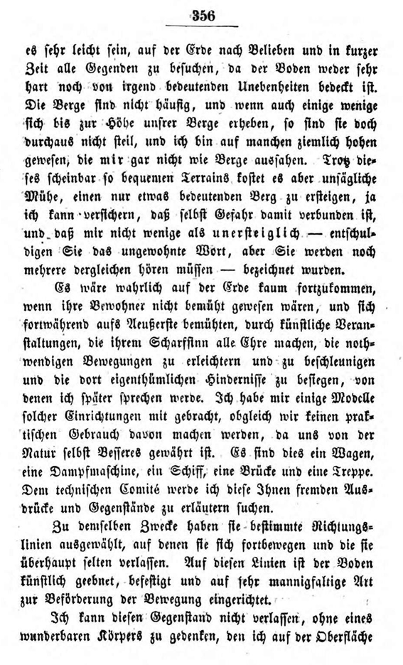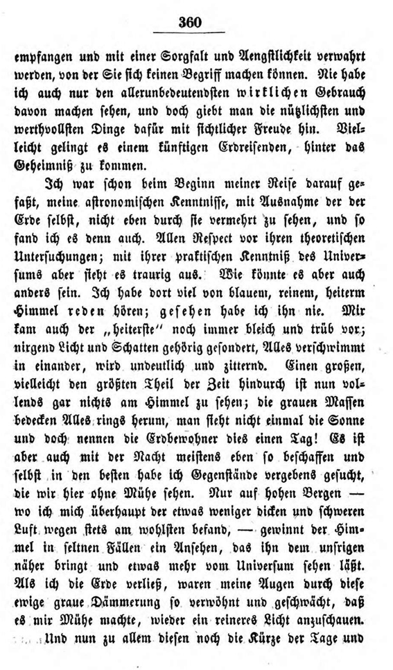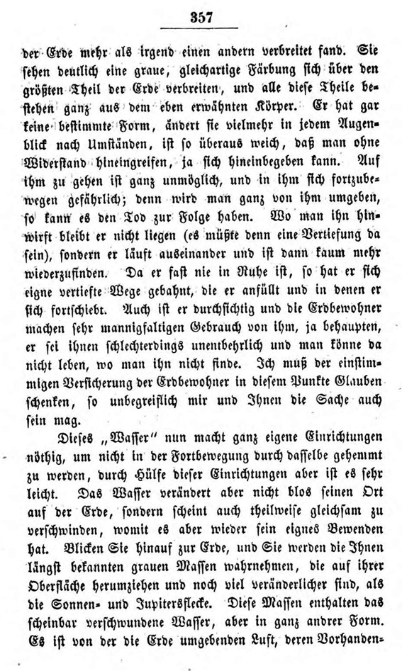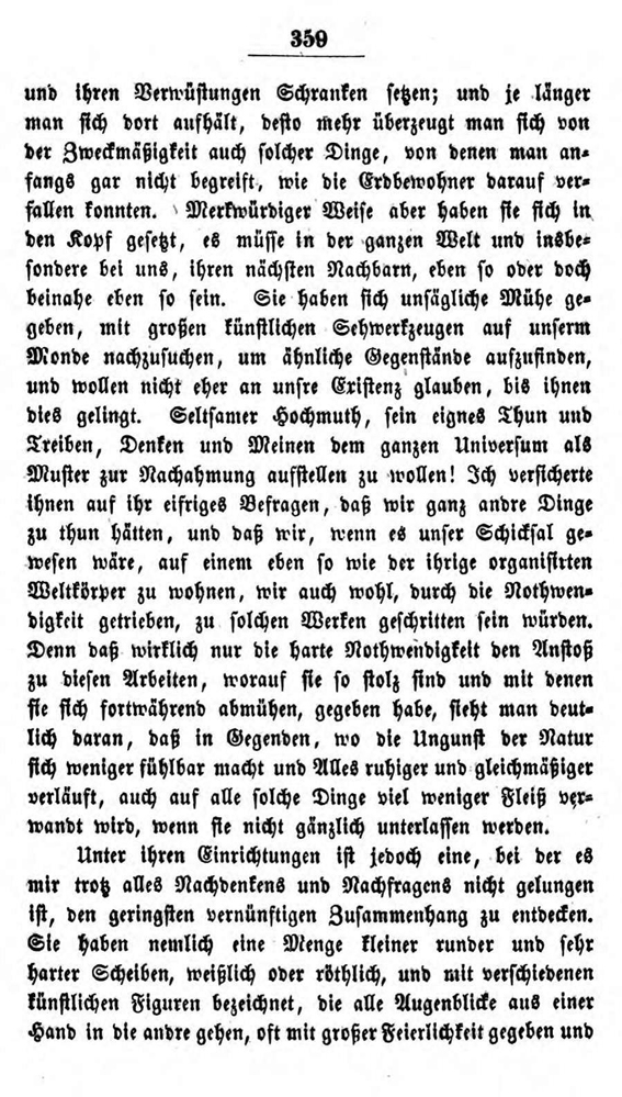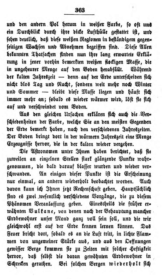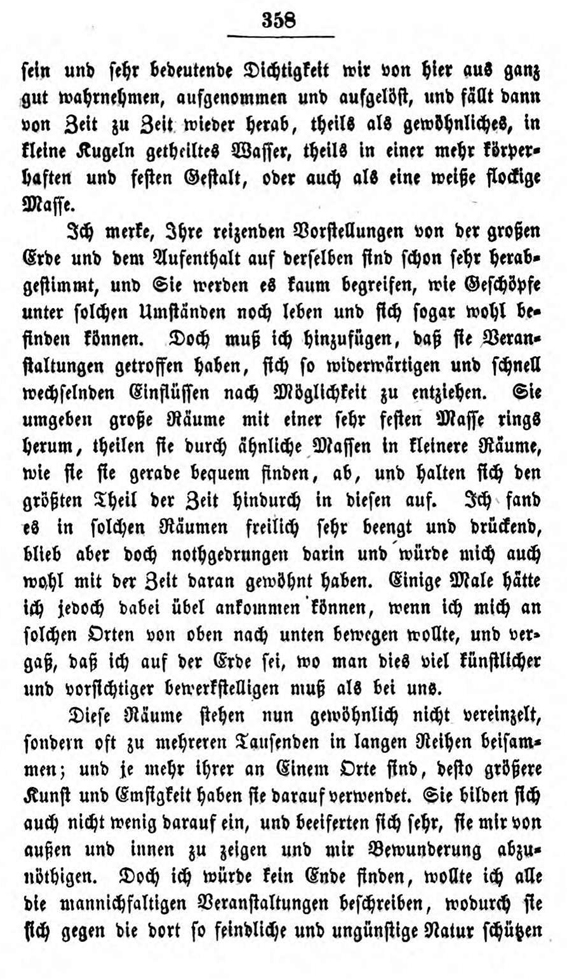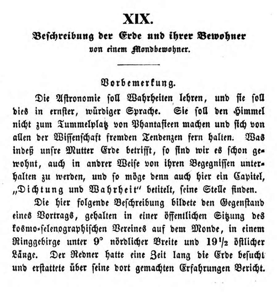 Im 19. Kapitel dieser Briefe lässt er einen Seleniten (so nennt er die fiktiven Mondbewohner) von einer Reise erzählen, die dieser zur Erde gemacht haben soll. Die Fiktion soll zeigen, wie ein außerirdischer Besucher die Verhältnisse auf der Erde wahrnehmen könnte.
