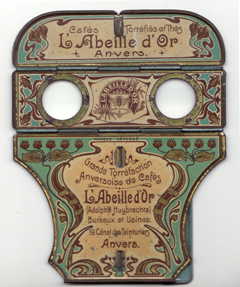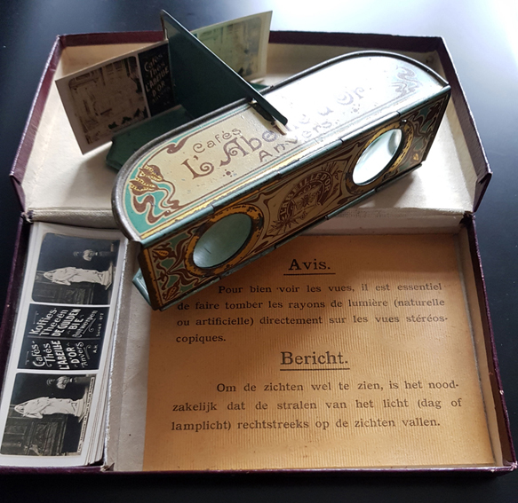 Es handelt sich um ein Taschen-Stereoskop aus Metall für Stereofotos des Formats 3 x 7 cm. Hergestellt hat es um 1910 die Neue Photographische Gesellschaft A. G. in Berlin Steglitz für Werbezwecke der Firma Adolphe Huybrechts, L’Abeille d’Or, Anvers, Cafés et Thes. – De Gulden Bie, Kaffe und Tee, Antwerpen, Belgien.