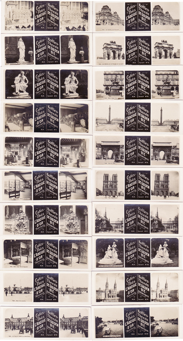 Auf den kleinen Stereofotos ist in der Mitte die Firmenbezeichnung angebracht. Der vollständige Satz zeigt 20 Photographien aus Paris.