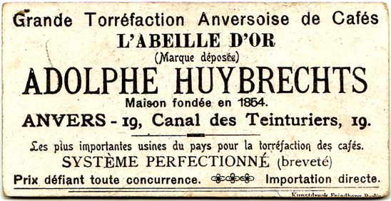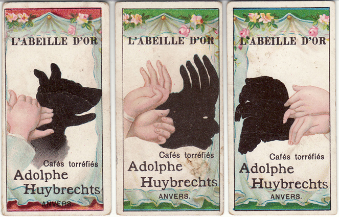 Auch bei anderen Werbemitteln nutzte die der Firma Adolphe Huybrechts optische Spielereien, so bei diesen Sammelbildern mit Schattenspielen, die den Produkten beigelegt wurden.