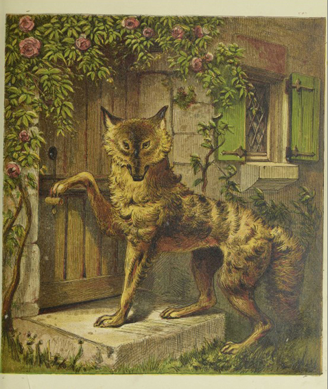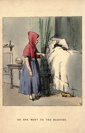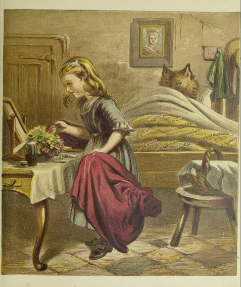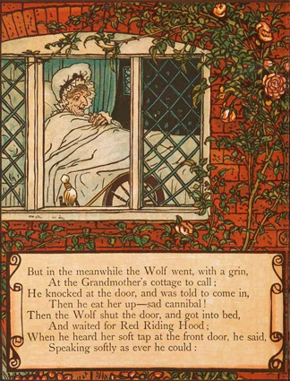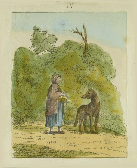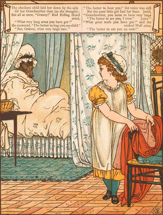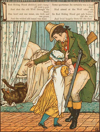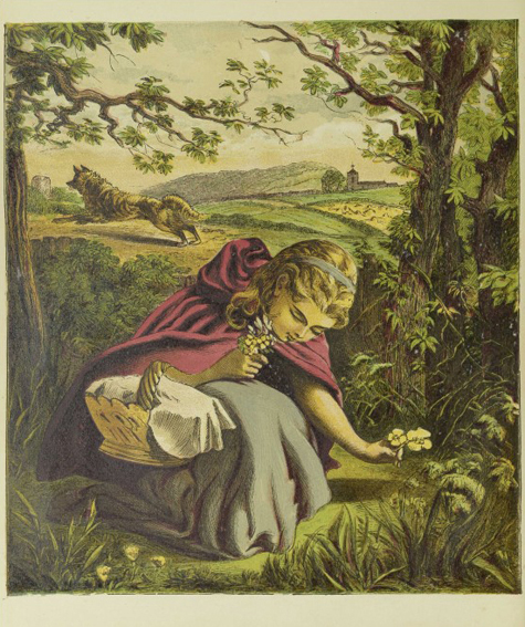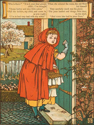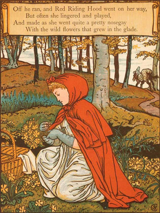 Walter Crane: Little Red Riding Hood. George Routedlge & Sons, London 1875; 8 Farbholzschnitte mit integriertem Text.
