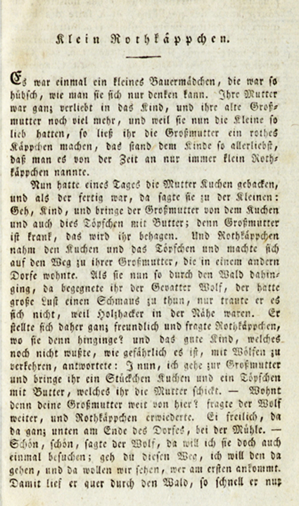 Es war einmal ein Bauermädchen, so hübsch und niedlich, als man nur eins sehen kann. Ihre Mutter war ganz in sie vernarrt, und noch mehr ihre Großmutter. Diese ließ ihr ein rothes Käppchen machen, das ihr so gut stand, daß man sie deßhalb nicht anders als Rothkäppchen nannte.