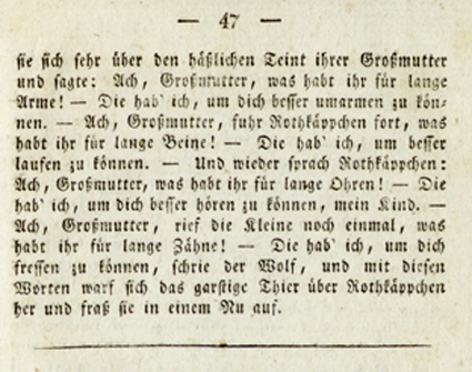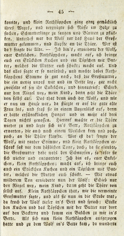 Nun fing der Wolf aus Leibeskräften zu laufen an auf dem kürzesten Weg, Rothkäppchen aber hatte den längsten Weg genommen, und hielt sich noch dazu überall auf, suchte Haselnüsse, lief bunten Schmetterlingen nach, und band sich Sträußerchen von Blümchen, die sie hie und da pflückte. Der Wolf war gar bald vor der Großmutter Hause. Er pochte an: poch, poch. – „Wer da?“ rufte die Großmutter. – „Mach nur auf, liebʼ Großmutter“ antwortete der Wolf mit verstellter Stimme – „ich bins, Euer Rothkäppchen, ich bring Euch Brodkuchen und ein frisches Butterbüchschen, das euch meine Mutter schickt.“ – Die Großmutter, die im Bette lag und krank war rief: „zieh nur an der Klinke, der Riegel geht gleich auf.“ Der Wolf zog und die Hausthür gieng auf. Nun fiel er über die arme Frau her, und fraß sie, mir nichts dir nichts, rein auf, denn er hatte ganzer drei Tage gefastet. Er machte darauf die Thüre wieder zu, legte sich ins Bette der Großmutter und wartete nun auf Rothkäppchen, die bald darauf kam, und an die Thür klopfte. Poch, poch! – „Wer da?“ Rothkäppchen, welche die grobe Stimme des Wolfs hörte, fürchtete sich anfangs davor; sie dachte aber hernach, daß die Großmutter vielleicht einen heisern Hals hätte, und antwortete: „Macht nur auf, ich bins, das kleine Rothkäppchen; ich bring euch frischen Kuchen und ein Butterbüchschen, das euch meine Mutter schickt.” – „Zieh nur an der Klinke, liebes Rothkäppchen, und der Riegel wird gleich aufgehen;“ rief der Wolf, und machte seine Stimme so klein, als er konnte. – Rothkäppchen zog an der Klinke und die Thür ging auf. Da der Wolf sie hereinkommen sah, kroch er unter die Bettdecke und sagte zu ihr: „Setze den Kuchen und das Butterbüchschen nur hin auf den Mehlkasten und hernach leg dich zu mir ein bischen ins Bette.“ Rothkäppchen that es, zog sich aus und wollte sich ins Bett legen, aber wie erschrack sie nicht, da sie die Decke aufschlug und sah, wie ihre Großmutter aussah. Ach, liebe Großmutter, fing sie an, was ihr für große Arme habt! – Die habʼ ich, meine Tochter, daß ich dich desto besser umarmen kann. – Ach, liebe Großmutter, was ihr für große und rauche Beine habt! – Die hab ich, meine Tochter, daß ich desto besser laufen kann. – Ach, liebʼ Großmutter, was ihr für große Ohren habt! – Die hab ich, daß ich desto besser hören kann. – Ach, lieb Großmutter, was ihr für große Augen habt! Die hab ich, meine Tochter, daß ich desto besser sehen kann. – Ach, liebʼ Großmutter, was ihr für große Zähne habt! – Und die habʼ ich, daß ich dich desto besser fressen kann.“ Und wie er das sagte, fiel der garstige Wolf über das arme Rothkäppchen her, und fraß es auf.