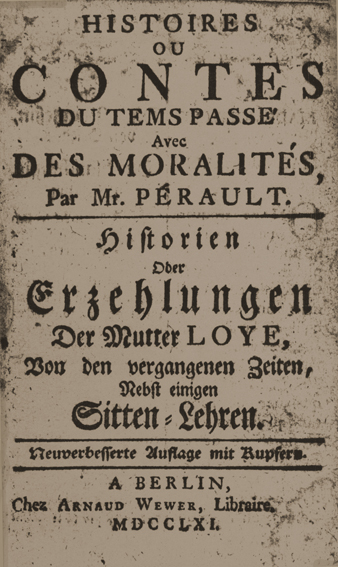 HISTOIRES/ OU/ CONTES/ DU TEMPS PASSE/ Avec des MORALITES/ PAR Mr. PERRAULT./ Historien/ Oder/ Erzehlungen/ Der Mutter LOYE,/ Von den vergangenen Zeiten,/ Nebst einigen/ Sitten-Lehren./ Neuverbesserte Auflage mit Kupfern./ A BERLIN,/ Chez ARNAUD WEWER, Libraire./ MDCCLXI. (1761)