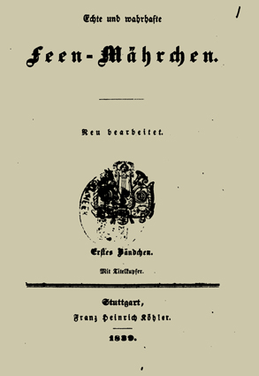 Echte und wahrhafte/ Feen-Mährchen./ Neu bearbeitet./ Erstes Bändchen./ Mit Kupfern./ Stuttgart,/ Franz Heinrich Köhler./ 1839.