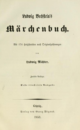 Ludwig Bechsteins Märchenbuch. Mit 174 Holzschnitten nach Originalzeichnungen von Ludwig Richter. Zwölfte Auflage. Erste illustrierte Ausgabe. Leipzig, Verlag von Georg Wiegand.13. Auflage. Leipzig: Georg Wigand, 1857.