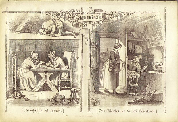 Illustration zum „Märchen von den drei Spinnfrauen“ im Volksbuch 1846 (rechts)