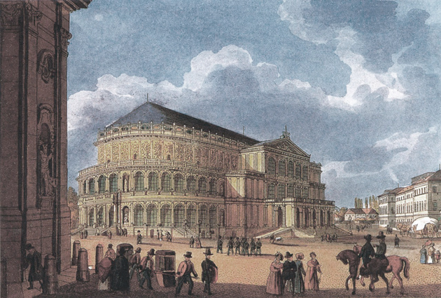 Das erste Opernhaus Sempers in Dresden, ca. 1850, Kolorierter Kupferstich von Carl Täubert