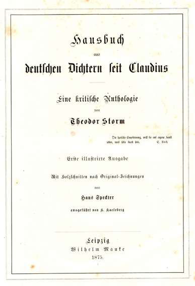 Hausbuch aus deutschen Dichtern seit Claudius. Eine kritische Anthologie von Theodor Storm. Erste illustrierte Ausgabe. Mit Holzschnitten nach Original-Zeichnungen von Hans Speckter ausgeführt von H. Kaeseberg. Leipzig 1875.