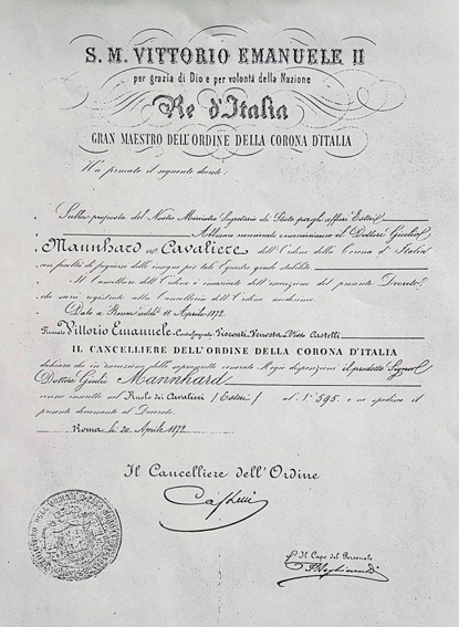 Urkunde für Julius Mannhardt. Mannhardt wird vom König von Italien, Viktor Emanuel II., zum Ritter des „Ordens der Krone von Italien“ ernannt. Am 20. April 1872 wird es vom Kanzler des Ordens bestätigt. Offenbar ging die Empfehlung vom Außenministerium aus.
