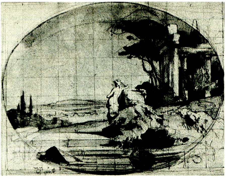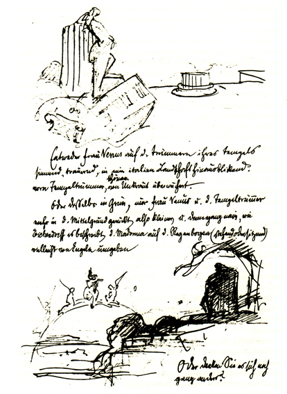 »– da stand am Rande des Wassers sie selbst, Venus, die lieblichste der Göttinnen, in ihrer ganzen unverhüllten Schönheit: den einen Arm hatte sie auf das Haupt gelegt, den andern hielt sie vor sich und schaute ruhig in den klaren Wasserspiegel. Das durch die grünen Ranken gedämpfte Sonnenlicht beleuchtete die schöne Gestalt, um die die farbigen Lichter spielten. So sehr wirkte die überraschende Schönheit des Bildes auf meine Einbildungskraft, daß ich völlig die Wirklichkeit vergessend die Erscheinung anstarrte. Nach einer Weile wandte sich die Gestalt, kauerte nieder und nahm, mir den Rücken zuwendend, die Stellung der badenden Venus an. «