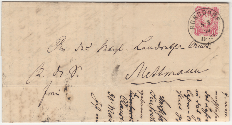 Es handelt sich um eine Dienstsache (K. d. S./ frei), die mit der am 1. Januar 1875 ausgegebenen 10 Pfennige rosa (Michel-Nr. 33a) bedarfsgerecht frankiert und mit dem Kreisstempel RONSDORF/ 5 3/75/ 10-11V entwertet wurde. Auf der Rückseite ist der Eingangsstempel abgeschlagen: Mettmann/ 5 3/75/ 3-4N.
