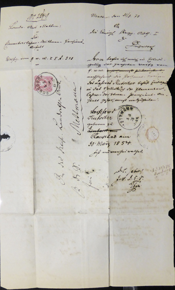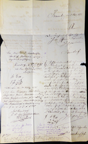Warum Vorder- und Rückseite beschrieben wurden, lässt sich erst erkennen, wenn man den Faltbrief öffnet. Innen- und Außenseite enthalten eine Reihe von Texten, die zwischen 2. und 31. März 1875 datiert sind und einen Vorgang dokumentieren, der mit den Personalien eines Lehrers verbunden ist.