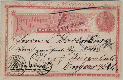 Am 28. November 1899 wurde dieser Neujahrsgruß auf der Rückseite einer Ganzsache in San José, Guatemala nach Deutschland geschrieben. Er ist adressiert an Herrn C. Dorenburg/ Fähnrich im Infant. Reg. № 166/ z.Z. Kriegsschule/ Engers a/Rh. Alemania!