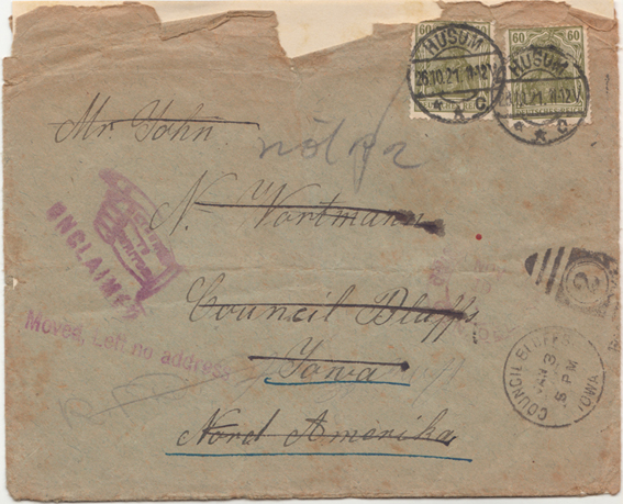 Bei der Zustellung in Council Bluffs traf der Postbote den Empfänger nicht an. Deshalb wurde der Brief im Post-Office and Custom-House niedergelegt und am 3. Januar 1922 nach Deutschland zurückgeschickt.