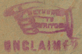 Das dokumentieren links zwei violette Stempel: ReturnED/ to/ WRITER/ unclaimd (Zurück an Absender/ nicht abgeholt) und Moved, Left no address (verzogen ohne Adresse zu hinterlassen); auf der Rückseite wurde der Stempel wiederholt; die Hand weist auf den Absender.