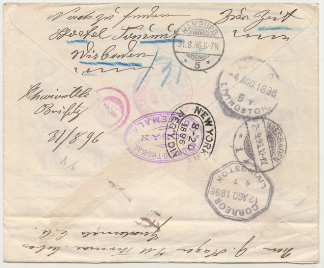 Das Postschiff nach New Orleans im US-Bundesstaat Lousiana übernahm den Brief am 12. und erreichte die USA am 18. August. Bis zur Übergabe an das Auslandspostamt in New York dauerte es zwei Tage. Hier wurde der Brief am 20. August noch einmal mit neuer Nummer als Einschreiben registriert und auf einen Postdampfer nach Deutschland verladen.
