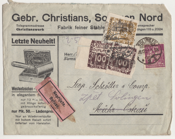 Ein Briefumschlag der Firma Gebr. Christians, Solingen mit aufgedruckter Werbung, wurde im Dezember 1921 an Herrn Leop. Schrötter & Comp.| Mähr - Ostrau adressiert.