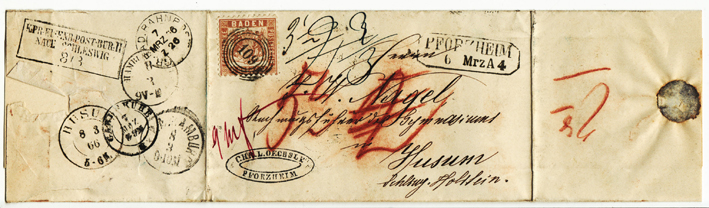 Dieser Brief aus dem Großherzogtum Baden (Firmenstempel CHR. L. OECHSLE| PFORZHEIM) dokumentiert die komplizierten Post- und Währungsverhältnisse im Deutschland in den Jahren vor der Reichsgründung von 1871. Er ist adressiert an Herrn| S. W. Nagel| Rechnungsführer des Gymnasiums| in| Husum| Schl<e>sw<i>g-Holstein.