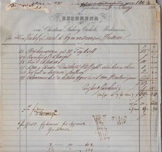 In den Pforzheimer Werkstätten produzierte der Mechanikus Christian Ludwig Oechsle Waagen, Thermometer und andere Geräte, die für den Physikunterricht benutzt wurden. Aus einem Katalog der Firma bestellte der Direktor des Gymnasiums Geräte im Werte von 60 Gulden.