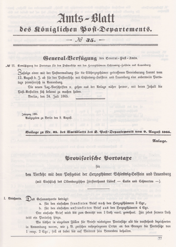 Die „Provisorische Portotaxe“ als Übereinkunft zwischen der Königlich Preußischen Postverwaltung und der Postverwaltung für die Herzogtümer Schleswig-Holstein und Lüneburg regelte ab dem 1.8.1865 den Postverkehr zwischen den Herzogtümern und dem DÖPV.