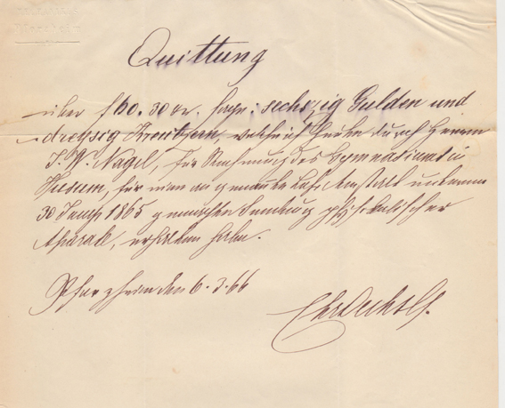 Der Rechnungsführer des Husumer Gymnasiums hat die Rechnungssumme von 60 Gulden und 30 Kreuzer süddeutscher Währung zunächst in die preußische und danach in schleswig-holsteinische Courant-Währung umgerechnet und diese Summe am 3. März 1866 in einem Geldbrief nach Darmstadt geschickt: 86 Reichsbankthaler und 9 Schillinge.