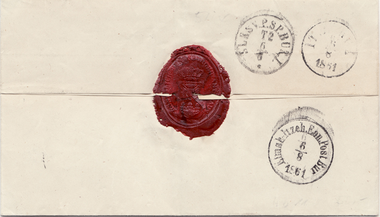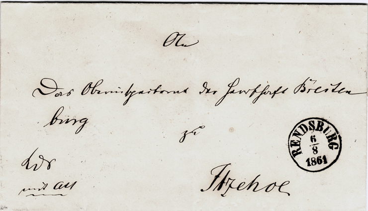 An/ Das Oberinspectorat der Herrschaft Breitenburg/ zu Itzehoe/ Kds/ mit Att. RENDSBURG/ 6/ 8/ 1861. Rückseite: Siegel KÖNIGLICH RENDSBURGER AMTSHAUS. Elmsh-Itzeh.Ebn.Post-Bur./ 6/ 8/ 1861, SCHLESV.P.SP.BUR/ T2/ 6/8 sowie Eingangsstempel ITZEHOE 6/ 8/ 1861.