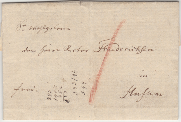 Brief von Hadersleben nach Husum vom 4. Juli 1830: Herrn wohlgeboren/dem Herrn Rector Friedrichsen/ in/ Husum, mit 1 Schilling Courant bar frankiert. Absender ist der Rektor der Gelehrtenschule in Hadersleben (gegründet 1567), Christian August Brauneiser (1777-1855); Empfänger ist Peter Friedrichsen (Rektor der Husumer Gelehrtenschule von 1821-1838). Friedrichsen wurde am 22. April 1790 in Satrup geboren, studierte Theologie (Dr. theol.) und unterrichtete seit 1817 als Kollaborator in Husum. Im Herbst 1821 wurde er erst einunddreißigjährig zum Rektor ernannt, nachdem sein Vorgänger Jakob Bernhard Friese (1769-1851) Ostern das Rektorat der Kieler Gelehrtenschule übernommen hatte. In dieser Funktion leitete Friedrichsen die Schule bis ins Jahr 1838, in dem er Pastor in Ivenstedt wurde (bis 1865). Während seines Rektorats besuchte Theodor Storm (1817-1888) die Schule von 1827 bis 1835. Friedrichsen starb am 7. März 1873 in Preetz.