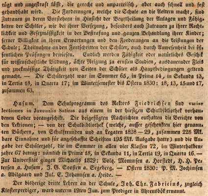 Die Husumer Gelehrtenschule konnte 1830 bereits auf eine dreihundertjährige Tradition zurückblicken; sie war als Reformationsgründung (1525) eine der humanistischen Bildungsanstalten im Herzogtum Schleswig. Auch im 19. Jahrhundert blieb es Aufgabe der Gelehrtenschulen, junge Menschen auf die Landesuniversität Kiel vorzubereiten, auf der man studieren musste, wenn man ein Amt als Arzt, Pastor, Lehrer oder Jurist in den Herzogtümern anstrebte; darüber hinaus vermittelte die Institution, in der seit Mitte des 17. Jahrhunderts dem muttersprachlichen Unterricht ein größerer Raum gegenüber dem herkömmlichen Lateinunterricht eingeräumt wurde, dem kaufmännischen Nachwuchs eine humanistische Grundbildung. Die Gelehrtenschule unterhielt fünf Klassen, in denen von Rektor, Conrektor, Subrektor, Cantor und Rechenmeister unterrichtet wurde. Diese schulgeldpflichtige Einrichtung blieb den Knaben der wohlhabenden Schichten vorbehalten. Die Lehrer wurden von der Stadt besoldet, man erwartete aber von den Bürgern weitere Zuwendungen an die Schulkasse.