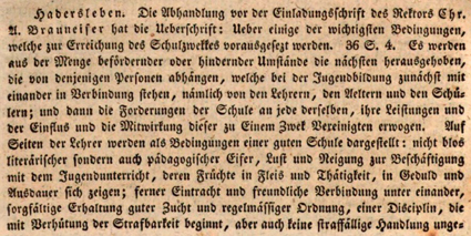 Friedrichsen hatte seinen Kollegen Brauneiser um Rat gebeten, wie er die zu erwartende Vacanz überbrücken könne, die durch den Weggang des dritten Lehrers Johann Christian Fabricius entstanden war. In seinem Brief beschreibt der Kollege die rechtliches Situation und bietet Friedrichsen seine Unterstützung an. Am Schluss seines Briefes äußert er seinerseits folgende Bitte: „Sie betrifft unsere Schulbibliothek, welche erst im Werden begriffen sich auf nicht mehr als vielleicht 500 Nummern beläuft.“ Er fragt, wie in Husum die Signaturen Fortsetzungswerken gehandhabt wird und wie die Aufstellung erfolgt. 1763 hatte der Rektor Peter Schaumann die Husumer Schulbibliothek gegründet, die durch Vermächtnisse und Schenkungen bis 1800 auf ca. 5000 Bände anwuchs. Sie war die erste öffentliche Büchersammlung Husums und bediente die Interessen der Theologen, der Lateinschüler und der interessierten gebildeten Öffentlichkeit.